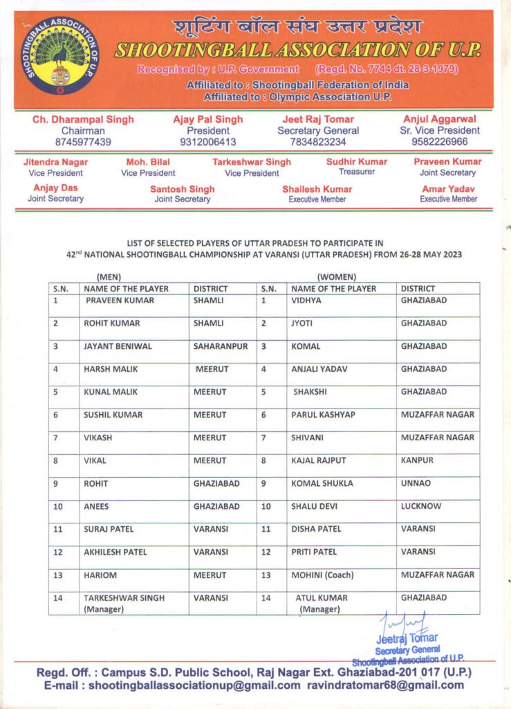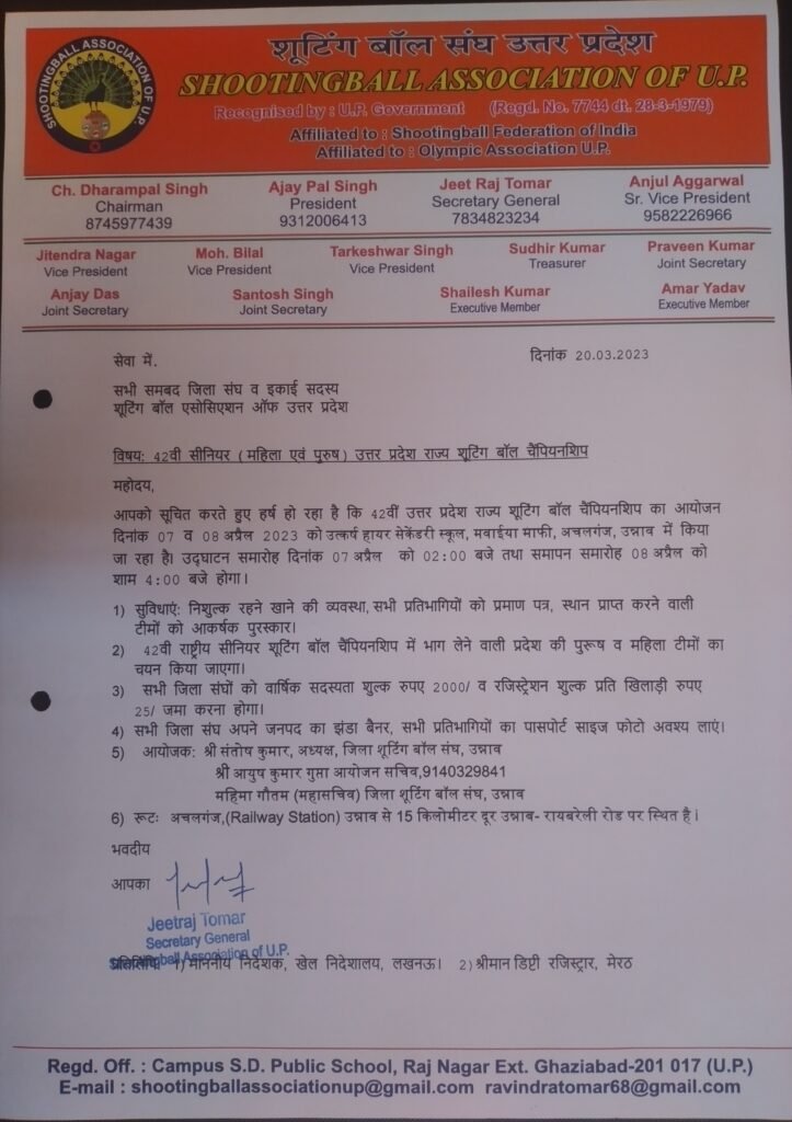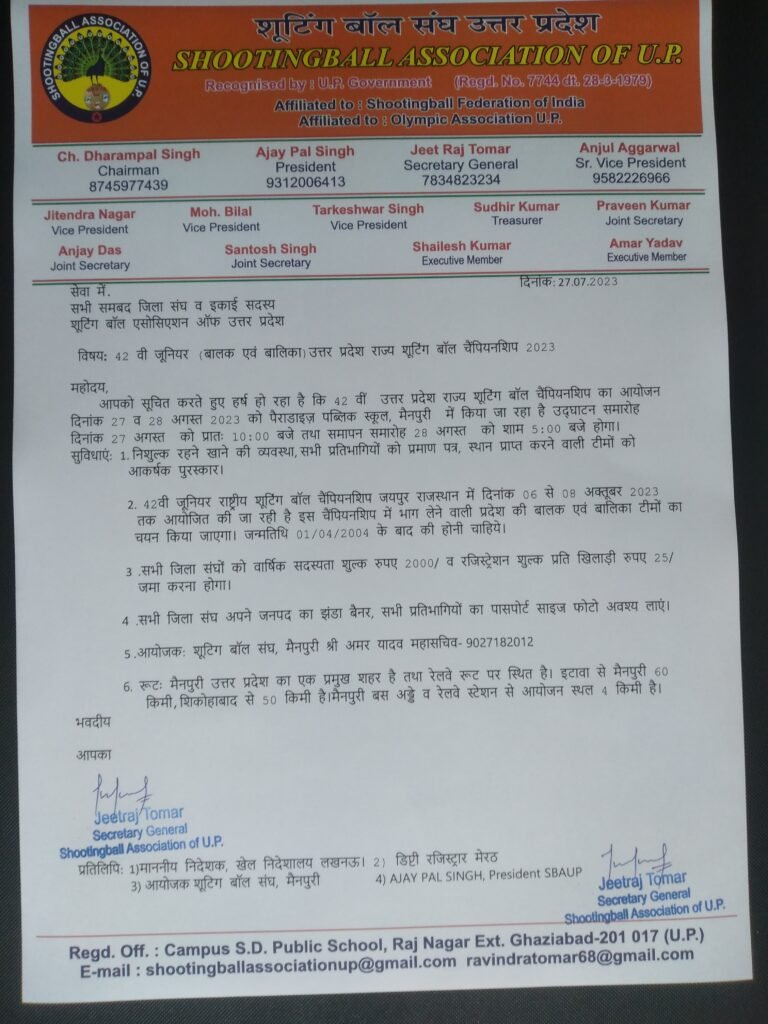 • 42nd Junior Boys & Girls U.P. State Shooting Ball Championship at Mainpuri from 27-28 August2023 .
